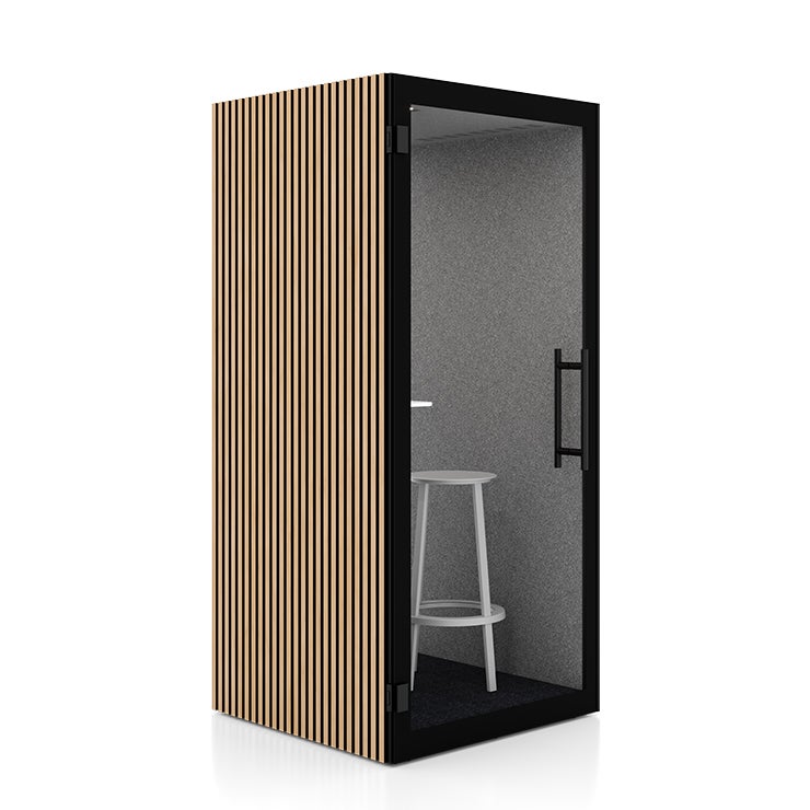 Chatbox Single, tyst rum för 1 person, Vit utsida med grå tygbeklädd insida, inkl. bord, belysning och ventilation
