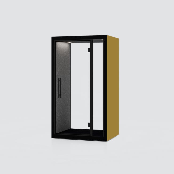 Chatbox Solo, tyst rum för 1 person, Gul Mustard utsida med grå tygbeklädd insida, inkl. bord, belysning och ventilation
