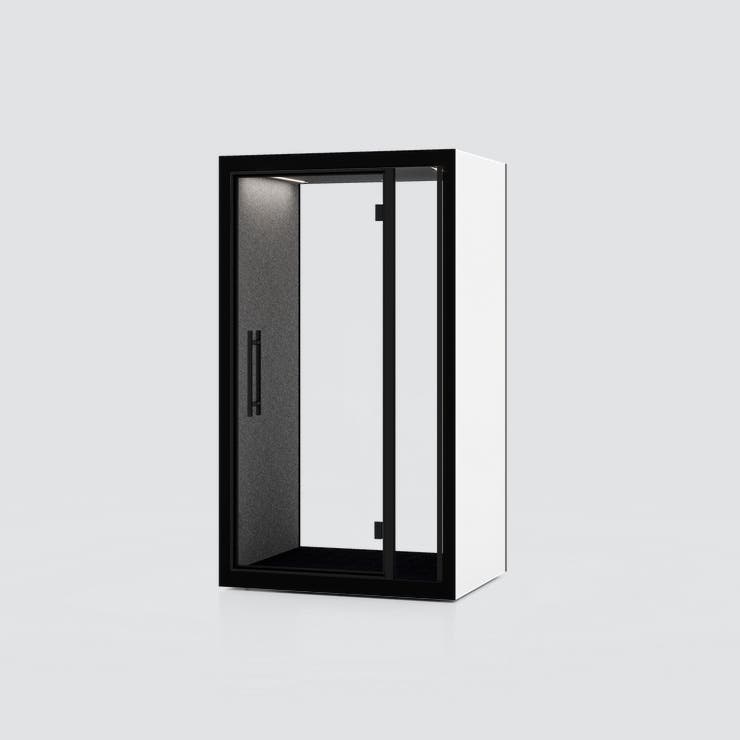 Chatbox Solo, tyst rum för 1 person, Vit utsida med grå tygbeklädd insida, inkl. bord, belysning och ventilation
