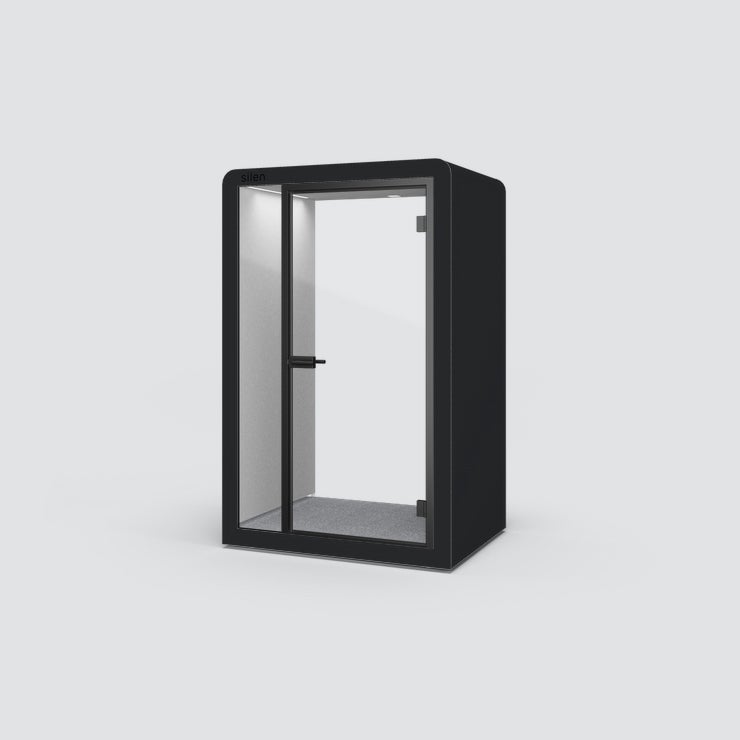 POD Silen Space 1.5, tyst rum för 1 person, Svart laminat med ljusgrå tygbeklädd insida,, belysning och ventilation
