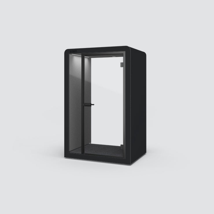 POD Silen Space 1.5, tyst rum för 1 person, Svart laminat med mörkgrå tygbeklädd insida,, belysning och ventilation
