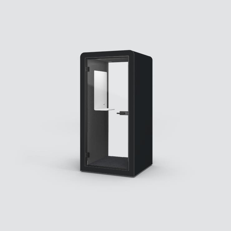 POD Silen Space 1, tyst rum för 1 person, Svart laminat med mörkgrå tygbeklädd insida, inkl. bord med whiteboard, belysning och ventilation