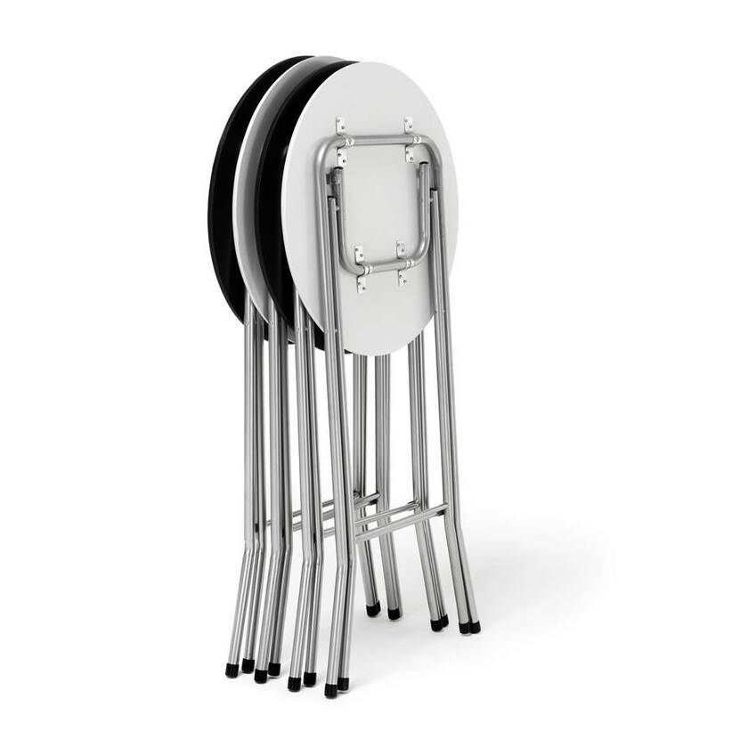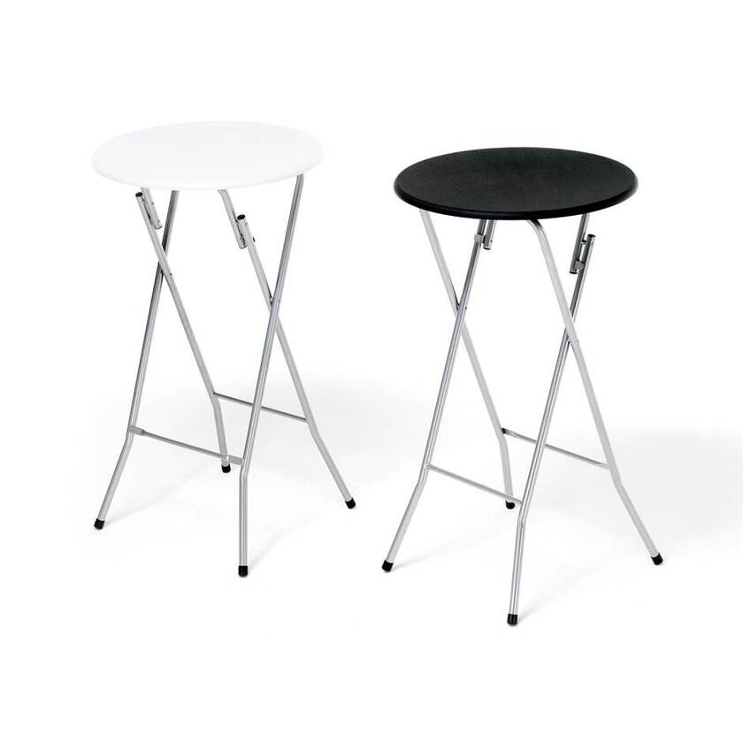 Ståbord som är hopfällbart och tar därför minimalt med utrymme när det inte används. Bordsskivan är av tålig svart eller vit PVC-folie med kärna av MDF. Grålackerat underrede av metall. Höjd 1050 mm. Rund skiva Ø600 mm.