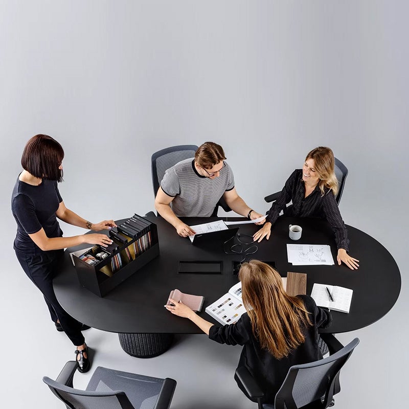 Parthos runda konferensbord är designade i syfte att passa för såväl mötesrum, loungerum eller som matsalsbord. De cylinderformade benen är klädda med 100% återvunnen PET-filt och har effektivt ljudabsorberande egenskaper.