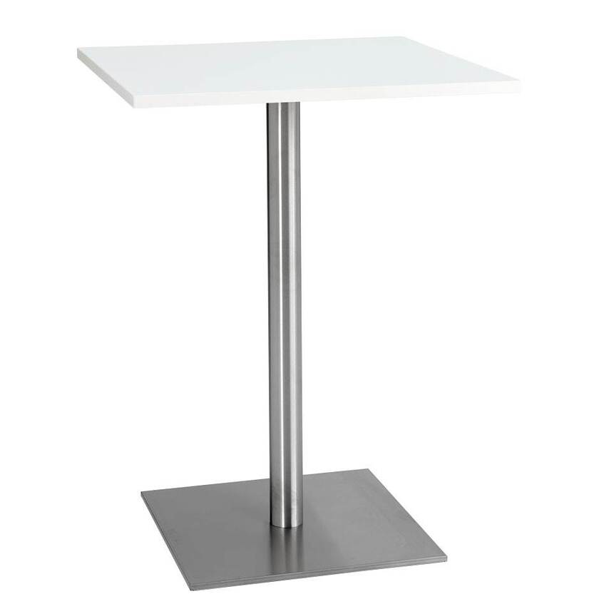 Ett stilrent och stabilt bord med tung bottenplatta. Rostfritt underrede, välj mellan borstat eller polerat.. Kvadratisk fot 555x555 mm. Bordshöjd 1085 mm. 25 mm Laminerad bordsskiva, valbar i bok-, björk-, ek-, vit- eller grå laminat