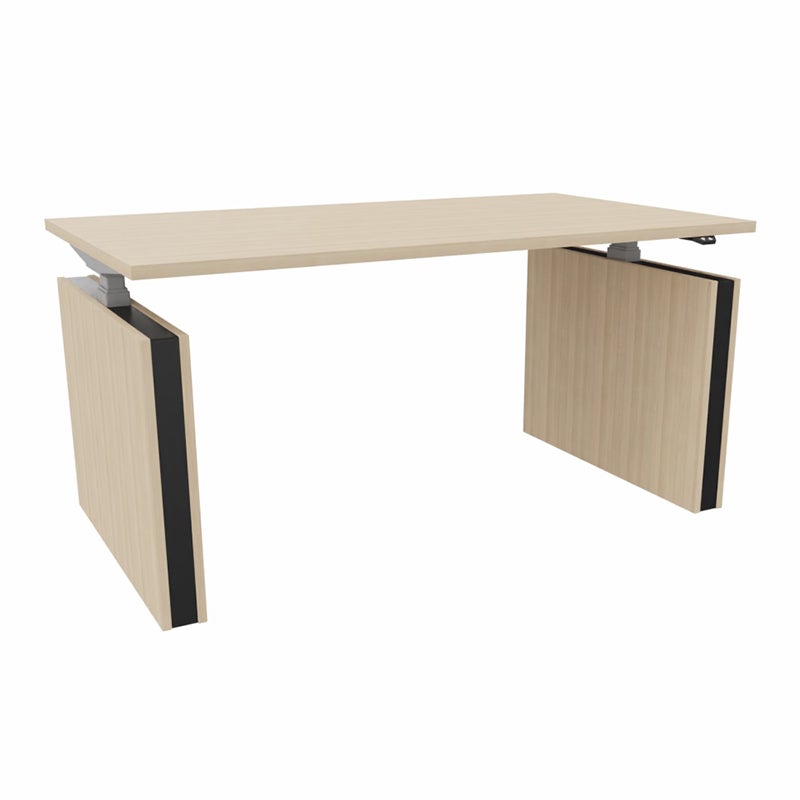Konstruktionen ger bordet ordentlig stabilitet. Utrustat med sensor för klämskydd. Valbar i fem olika laminat på bordsskiva, tre olika färger på stativ och tre olika färger på inlägget i gavlarna.