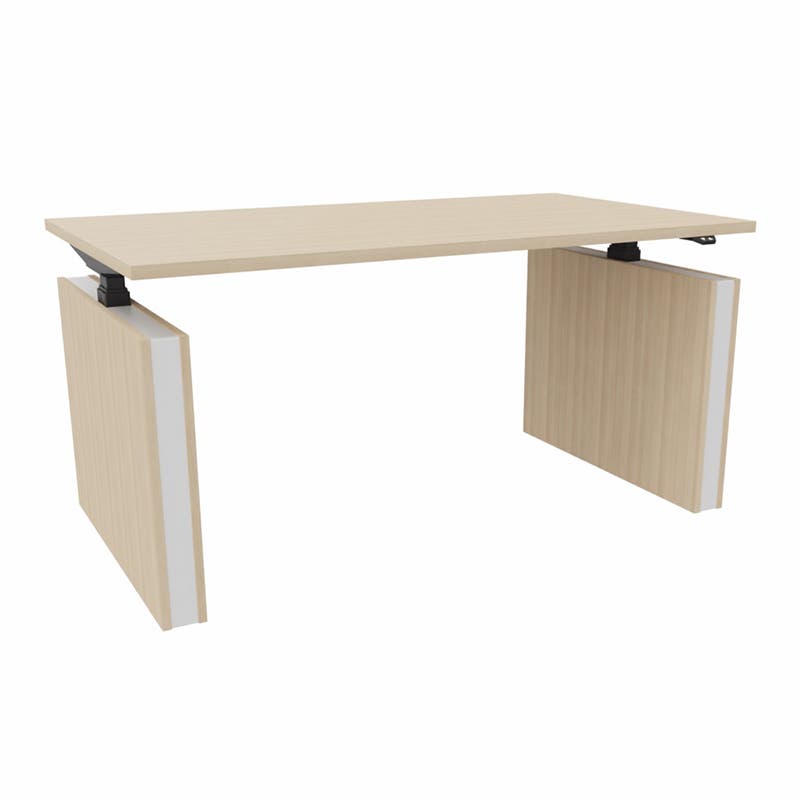 Konstruktionen ger bordet ordentlig stabilitet. Utrustat med sensor för klämskydd. Valbar i fem olika laminat på bordsskiva, tre olika färger på stativ och tre olika färger på inlägget i gavlarna.
