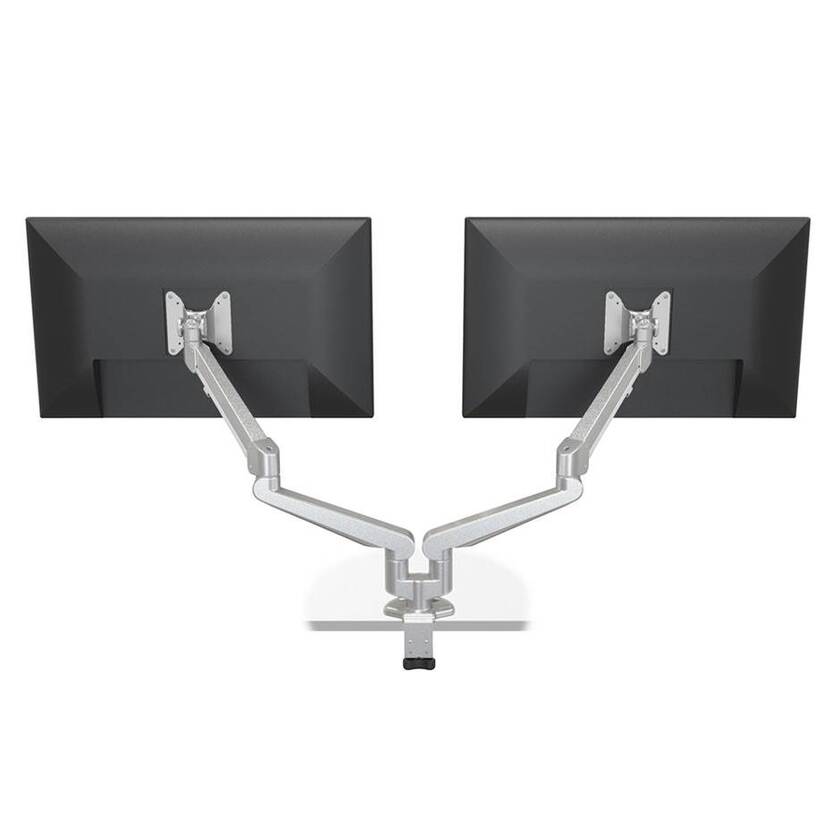 Dubbel gasfjädrad monitorarm. 2-armad, med 5 leder. Utrustad med Quick-Hookfunktion. Kraftig design helt i aluminium av högsta kvalitet. Går att justera monitorerna individuellt eller tillsammans som en enhet. Komplett med borsklämfäste och genomföringsfäste.