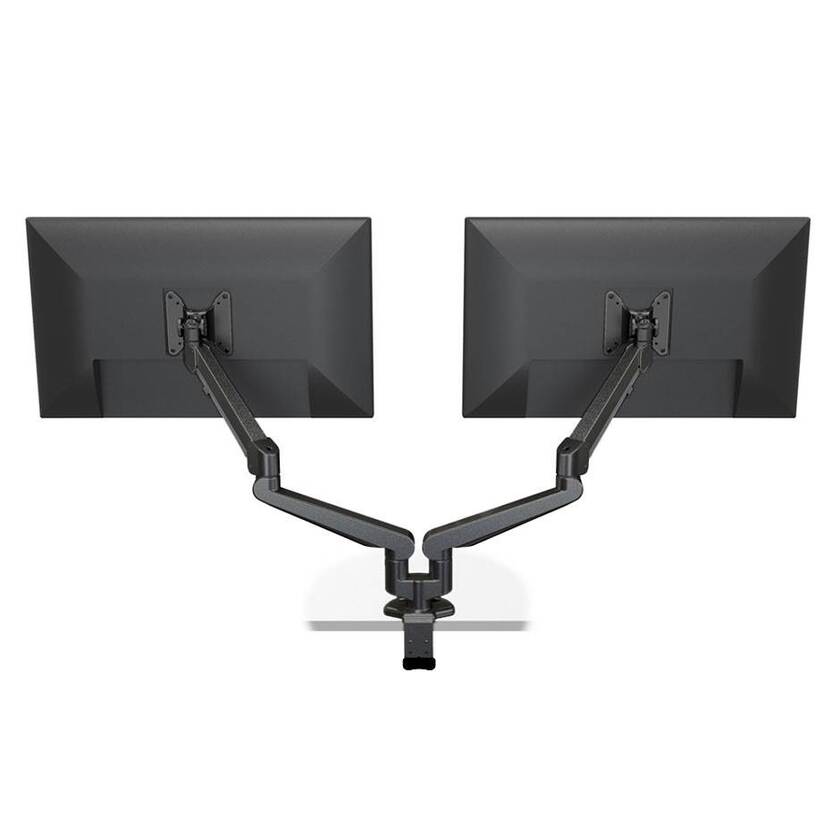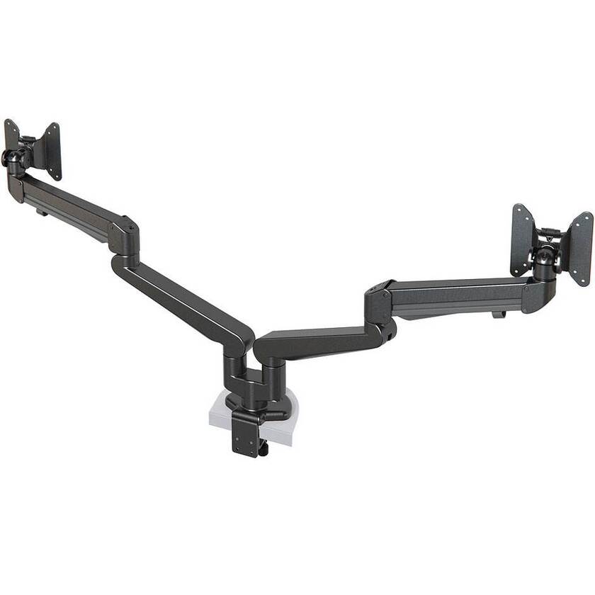 Dubbel gasfjädrad monitorarm. 2-armad, med 5 leder. Utrustad med Quick-Hookfunktion. Kraftig design helt i aluminium av högsta kvalitet. Går att justera monitorerna individuellt eller tillsammans som en enhet. Komplett med borsklämfäste och genomföringsfäste.
