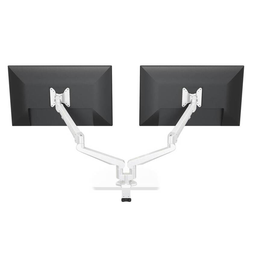 Dubbel gasfjädrad monitorarm. 2-armad, med 5 leder. Utrustad med Quick-Hookfunktion. Kraftig design helt i aluminium av högsta kvalitet. Går att justera monitorerna individuellt eller tillsammans som en enhet. Komplett med borsklämfäste och genomföringsfäste.