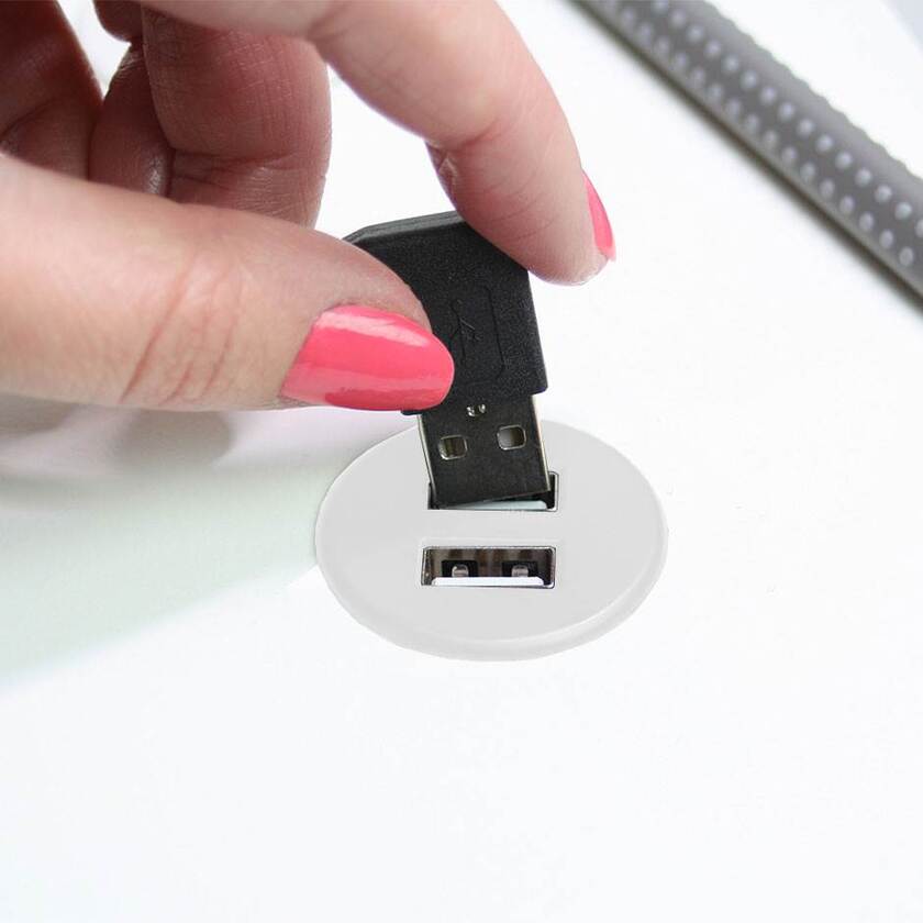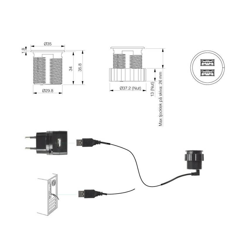 Powerdot Micro tillgodoser behovet av en liten, elegant USB-laddare som passar nästan överallt. Trots en diameter på ringa 30 mm är den utrustad med dubbla USB-portar för laddning om totalt 2A. Levereras med 1,5 m laddkabel och stickproppsadapter. Kan även kopplas via annan USB-port. Välj svart eller vitt utförande. Observera vid montage att skivan/godset kan vara max 26 mm tjock. Borrmått Ø30 mm. Produktbild nr. 5 visar ritningsmått.