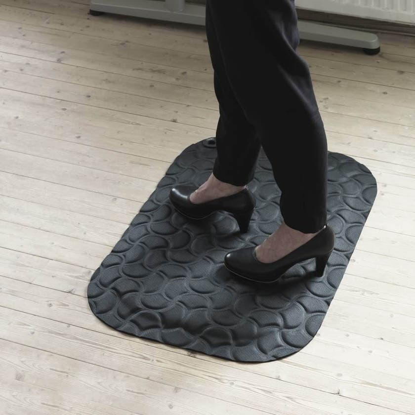 Du behöver inte välja mellan att ha joggingskor eller att få ont i fötterna när du står upp på jobbet! "StandUp!" är en smart ergonomisk arbetsplatsmatta som fördelar belastningen på fötterna. Skaffa dig en nyttig vana på jobbet. Flytta stolen, gör plats för "StandUp!" - använd ditt ståbord och må bättre!