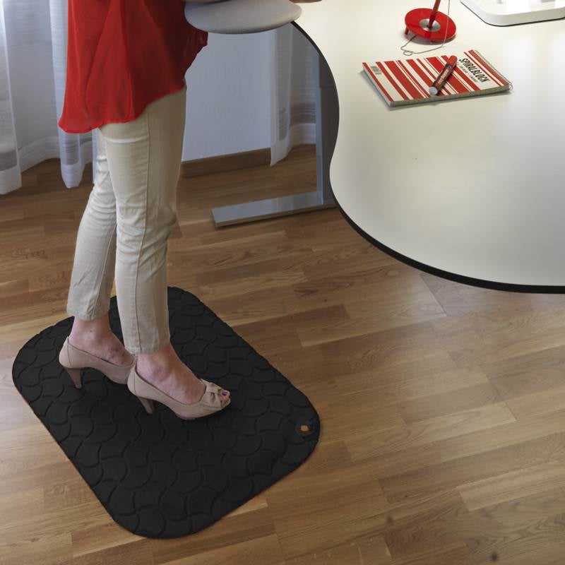 StandUp är en ergonomisk arbetsplatsmatta som fördelar belastningen på fötterna. Ovansida av filtliknande, slitstark och smutstålig polypropylen, undersida av nitrolgummi. Finns i flera färger. Mått 530 x 770 mm.