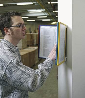 Väggstället är tillverkat av metall, vilket gör det slitstarkt och tåligt. Levereras komplett med 10 st A4-paneler med rubrikhållare.