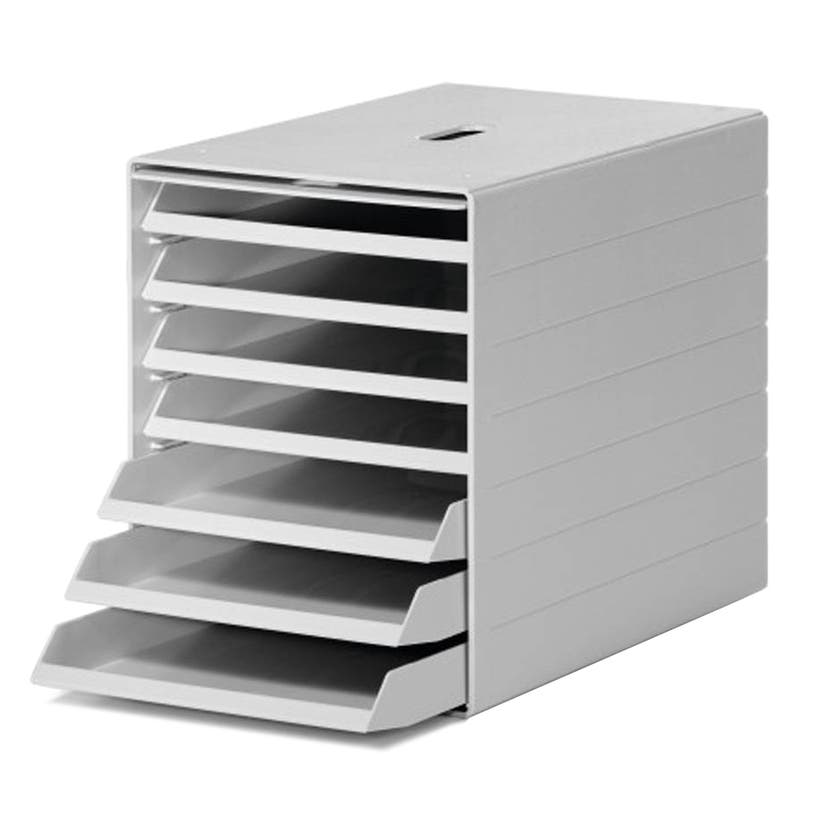 Praktisk blankettförvaringsbox med 7 st utdragbara brev-/blankettbackar i C4-format. Tillverkad i polystyrenplast. Utrustad med fällbar lucka. Kan skruvas i vägg eller under bordsskiva alternativt placeras i hylla, skåp eller på bord. Mått B:250 x D:365 x H:322 mm. Förvaringskassetten finns i färgerna ljusgrå och svart. Förvaringskassett finns även i modell utan fällbar lucka.