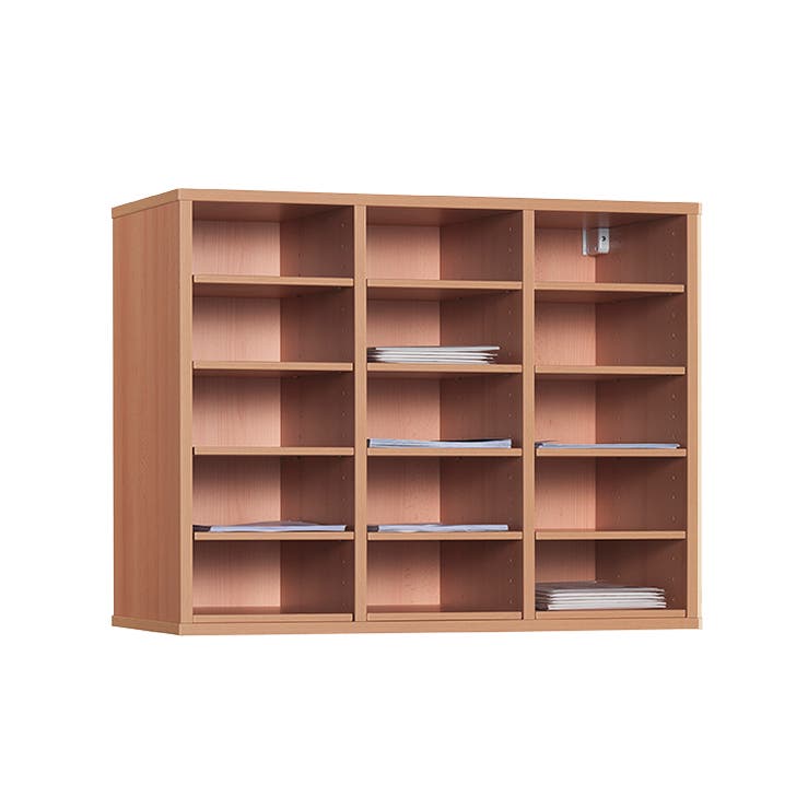 Postsorterings-/blanketthylla för rationell postsortering och blankettförvaring. Kan ställas på bord eller bänkskiva alternativt monteras på vägg, beslag för väggmontage ingår. Hyllan har 15 sorteringsfack, extra sorteringshyllplan finns som tillbehör.