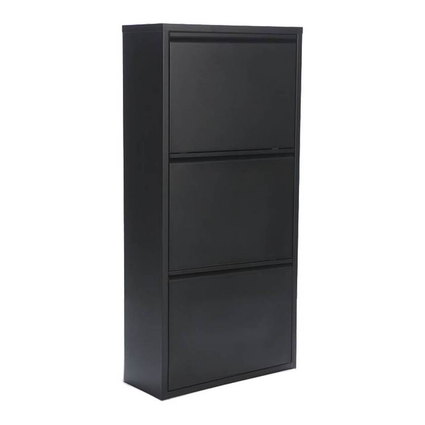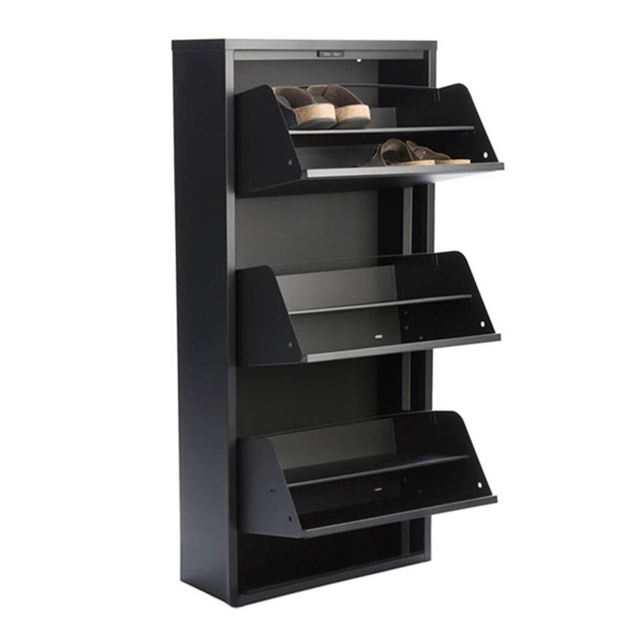 Skoskåp i svartlackerad plåt. Tre fällbara luckor/skohyllor, som stängs med magnet. Ryggplåten är förborrad för väggförankring.