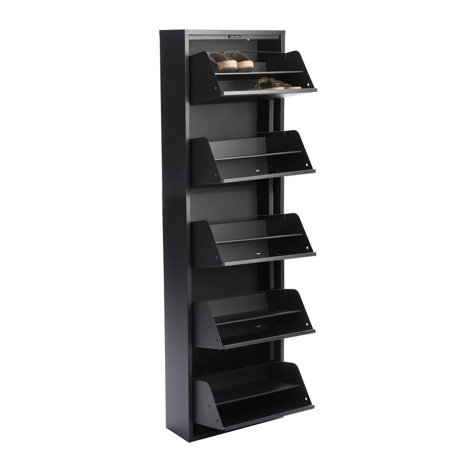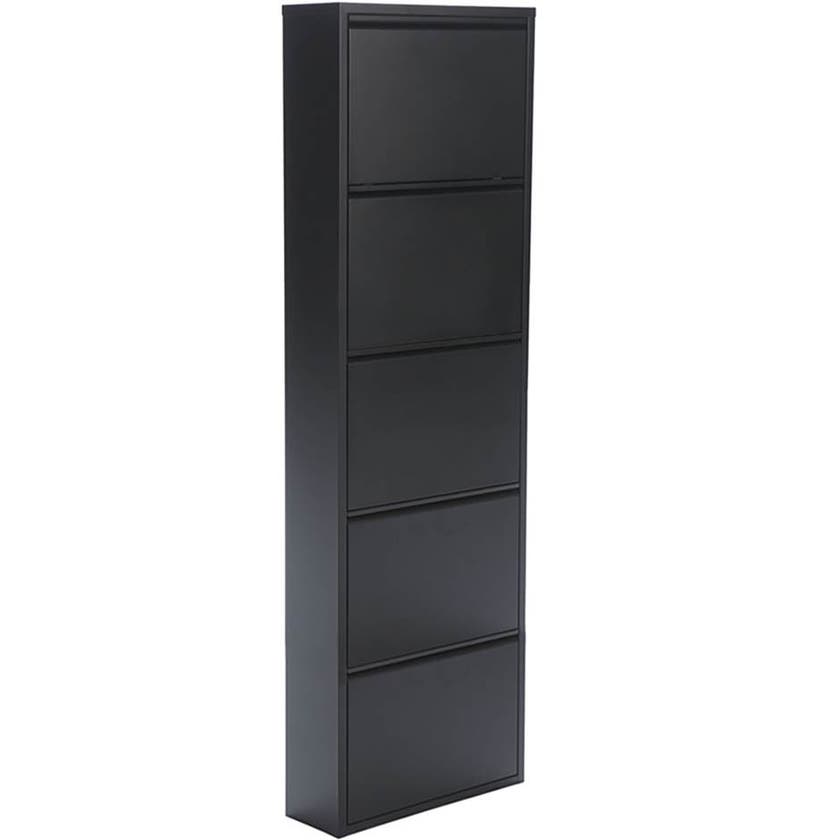 Skoskåp i svartlackerad plåt. Fem fällbara luckor/skohyllor, som stängs med magnet. Ryggplåten är förborrad för väggförankring.