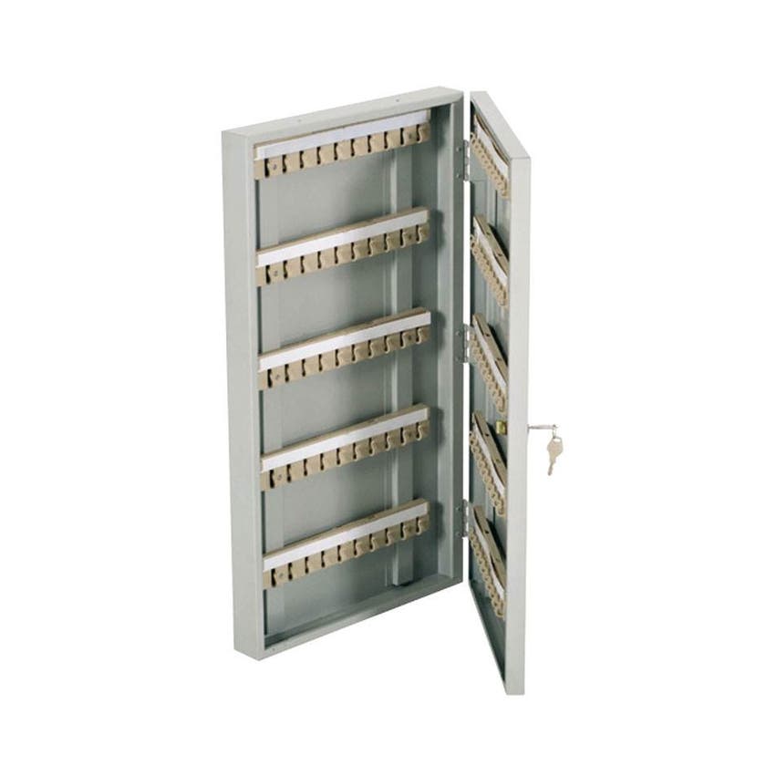 Prisvärt nyckelskåp med 100 krokar. Levereras komplett med nyckelbrickor. Dörr med cylinderlås, två nycklar medföljer. Lackerat i ljusgrå färg.