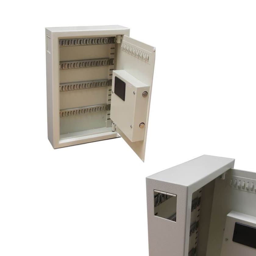 Nyckelskåp med omprogrammerbart elektroniskt kodlås. Skåpet har plats för 100 nycklar. Utrustat med ett praktiskt nyckelinkast på sidan av skåpet.