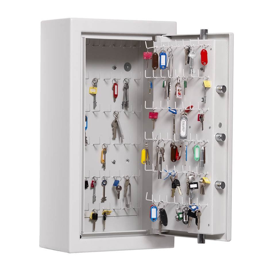 Klassade Nyckelskåp Top SSF 3492. Rejäla nyckelskåp inredda med långa krokar för säker förvaring. FInns i 3 olika storlekar. Med 56 st krokar, 102 st krokar eller 668 st krokar. Varianterna med 56 & 102 krokar går att montera på vägg. Vid väggmontage rekommenderas avlastningsbord som finns listat bland tillbehör. Exakta mått och vikt på skåpen står angett under respektive produktspecifikation.