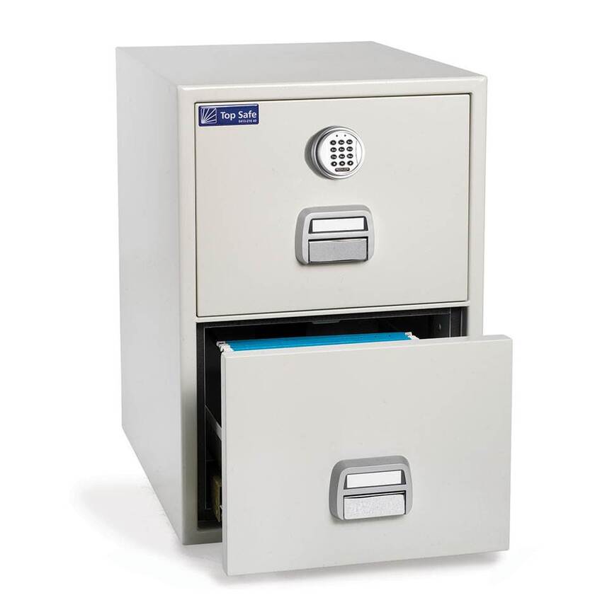 Brandklassat hängmappsskåp med två utdragbara lådor som löper på kullagerexpansioner. Skåpet är brandklassat 90 P enligt NT Fire 017. Varje låda är separat isolerad och försedd med spärrlås. Endast en låda i taget kan dras ut för att undvika tipprisk. Lådans generösa innermått, B400 x D526 x H285 mm, gör att den utan problem rymmer minst 10 hängande A4-mappar. Valbar med nyckellåsning (inkl.2 nycklar) eller med elektroniskt kodlås. Översta lådan är utrustad med centrallås som låser bägge lådor samtidigt.. Sekretesskydd. Totalt mått B528 x D678 x H766 mm. Hängmappskåpet är lackerat i coated metal offwhite. Alla delar är inkluderade så att montering kan utföras vid leverans.