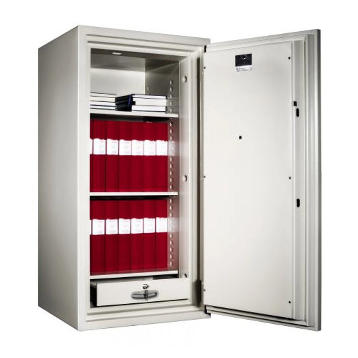 Brandklassat dokumentskåp 120 min, enligt NTFire 017. Avsett för förvaring av affärshandlingar, bokföringsmaterial, dokument, kontrakt mm. Vikt: 303 kg. 2 plan + utdragbar låda.