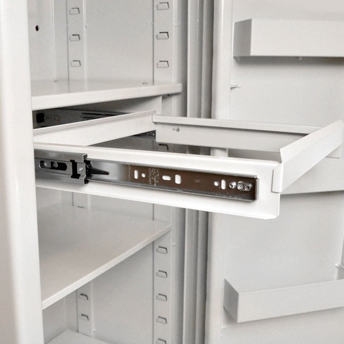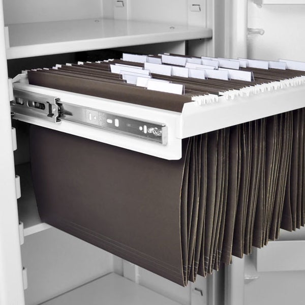 Som tillbehör finns extra hyllplan, elektroniskt kodlås, låsbart innerskåp med brevinkast, innerskåp med 3 låsbara fack, hängmappsram samt 3-sidig kroklist med 24 krokar.