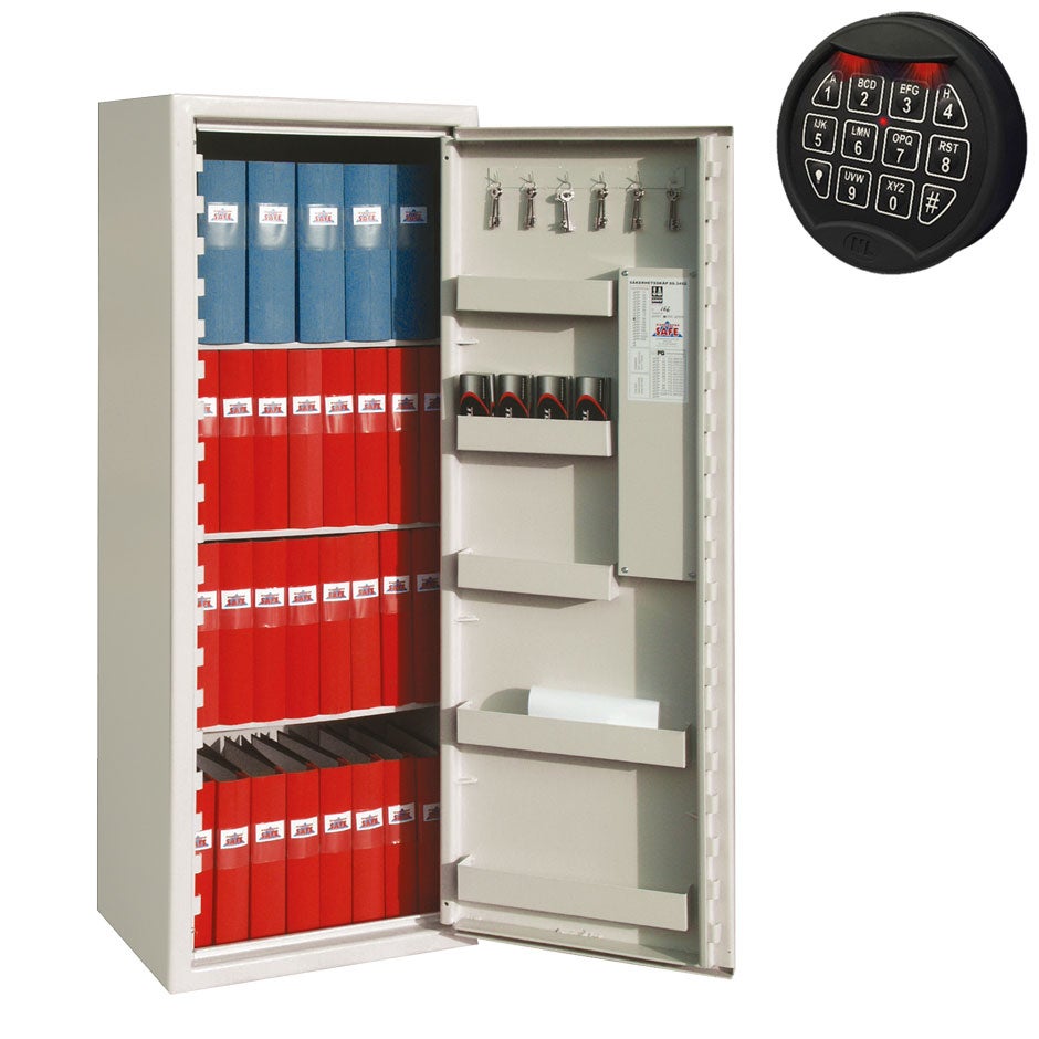Godkänt säkerhetsskåp med kombi-inredning, certifierat enligt SS-3492. Skåpet är även godkänt som vapenskåp. Levereras komplett med 3 flyttbara hyllplan och kodlås, som förenklar åtkomligheten i de fall där det är fler än 2 st användare av skåpet.