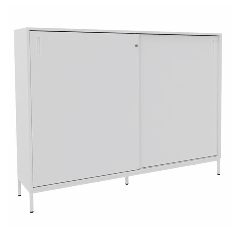 Skjutdörrskåp Sense med 3 plan. Med ett skjutdörrskåp optimerar du tillgängligheten och slipper ha öppna dörrar som är i vägen. Låsbart, infällda handtag.