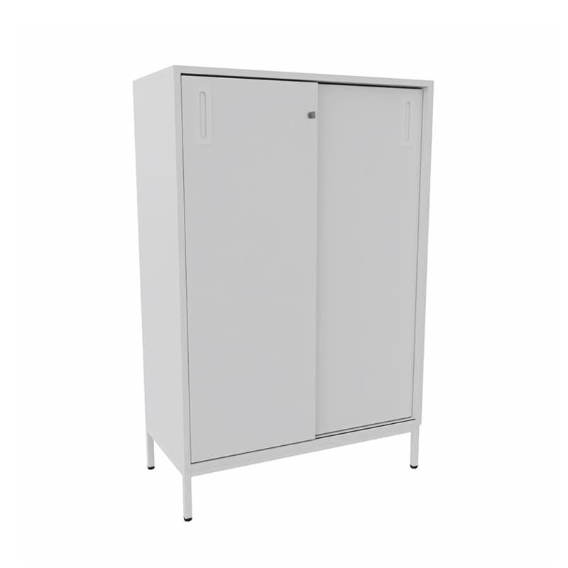 Skjutdörrskåp Sense med 3 plan. Med ett skjutdörrskåp optimerar du tillgängligheten och slipper ha öppna dörrar som är i vägen. Låsbart, infällda handtag.