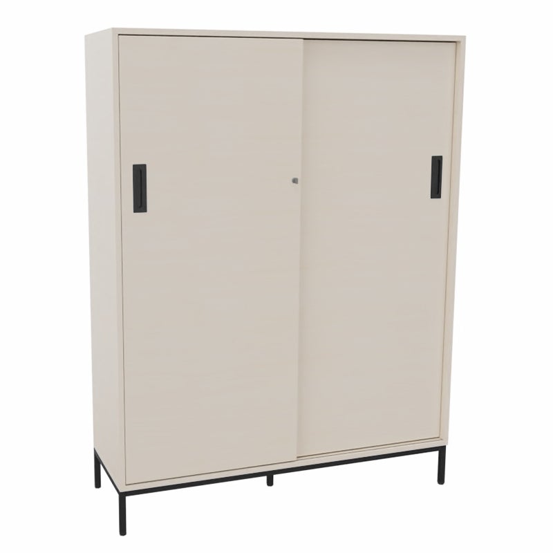 Skjutdörrskåp Sense med 4 plan. Med ett skjutdörrskåp optimerar du tillgängligheten och slipper ha öppna dörrar som är i vägen. Låsbart, infällda handtag.
