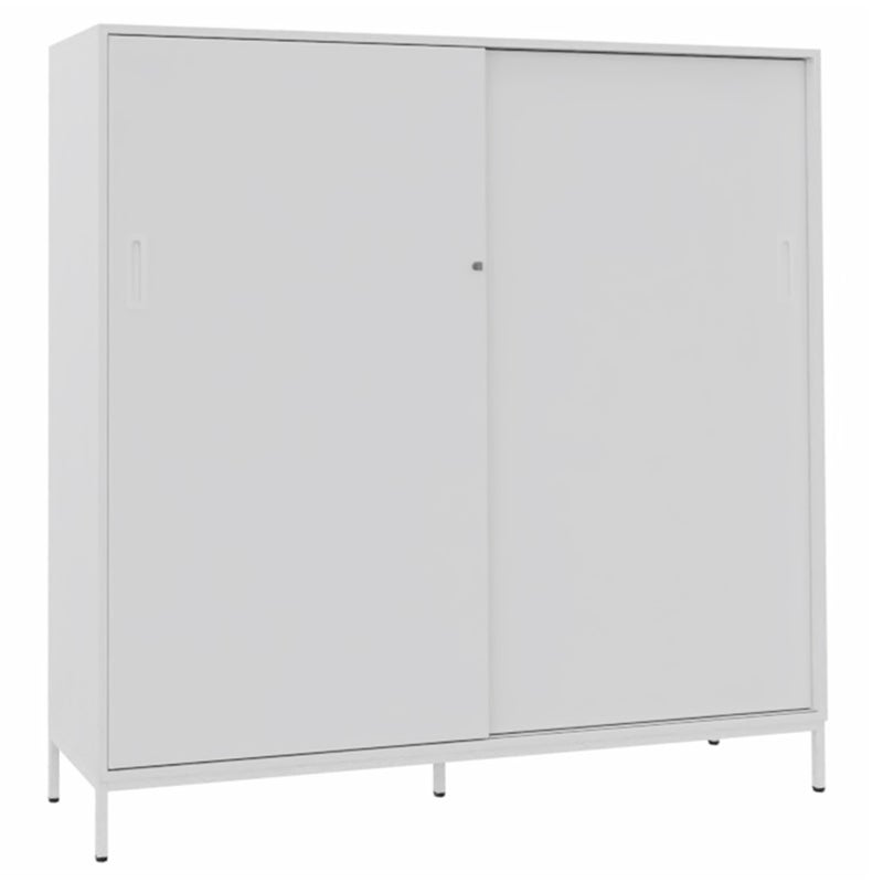 Skjutdörrskåp Sense med 4 plan. Med ett skjutdörrskåp optimerar du tillgängligheten och slipper ha öppna dörrar som är i vägen. Låsbart, infällda handtag.