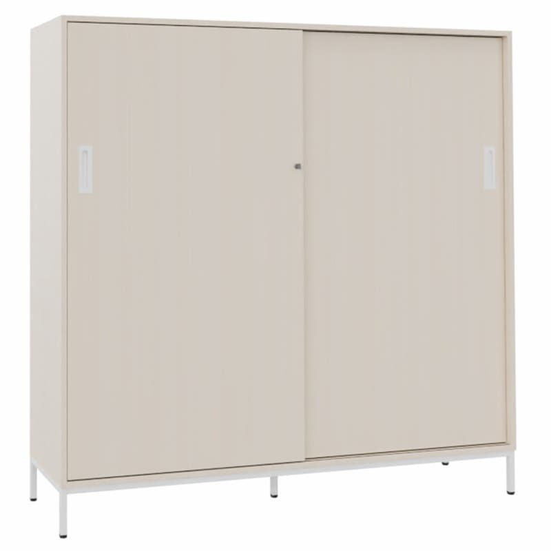 Skjutdörrskåp Sense med 4 plan. Med ett skjutdörrskåp optimerar du tillgängligheten och slipper ha öppna dörrar som är i vägen. Låsbart, infällda handtag.
