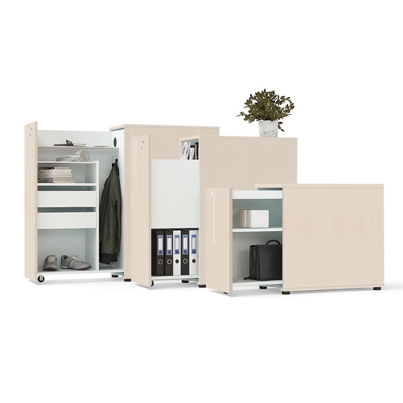 Som standard låsbart och inrett med två hyllplan åt höger och två hyllplan åt vänster vilket ger åtkomst från två håll och därför kan användas mellan två arbetsstationer. Översta hyllan funkar som praktisk pennhylla/småförvaring. Specifka önskelmål går att uppfylla, såsom usb-laddare, lådförvaring, hängmappssystem etc. Hör då av dig till någon av våra säljare så hjälper de till att utforma skåpet efter dessa önskemål.