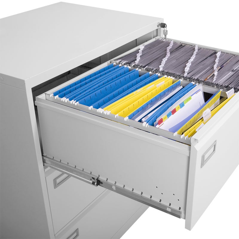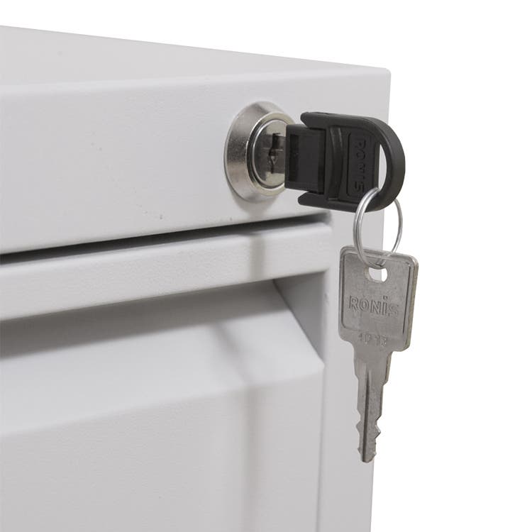 Robust och stilrent flankskåp för säker förvaring. Skåpet är vippsäkert och utrustat med centrallås. Ställbara för A4 alt. foliomappar. Tre lådor, varje låda rymmer ca 130 hängmappar. Lackerat i stryktålig grå strukturlack. Levereras monterat. Som tillbehör finns hängmappar. I skåpserien finns även flankskåp med två eller fyra lådor samt enkla mappskåp.