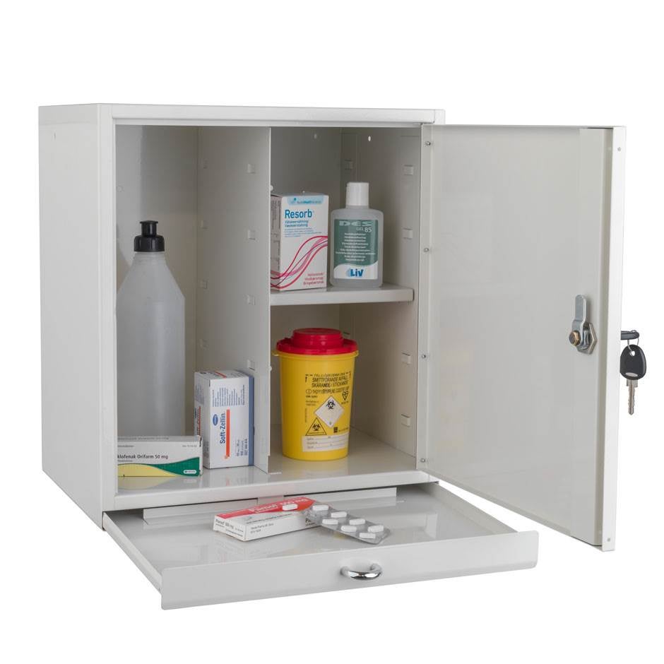 Lättplacerat och hanterbart medicinskåp som är väldigt populärt inom vård och omsorg. Skåpet ger ett visst stöldfördröjande skydd och håller obehöriga personer borta. Inredningen består av ett flyttbart hyllplan samt en utdragbar avlastningsskiva. Skåpet är förberett för bultning i botten samt upphängning på vägg. Jessica levereras som standard med cylinderlås, men kan fås med elektroniskt kodlås och intelligent låssystem vid förfrågan.