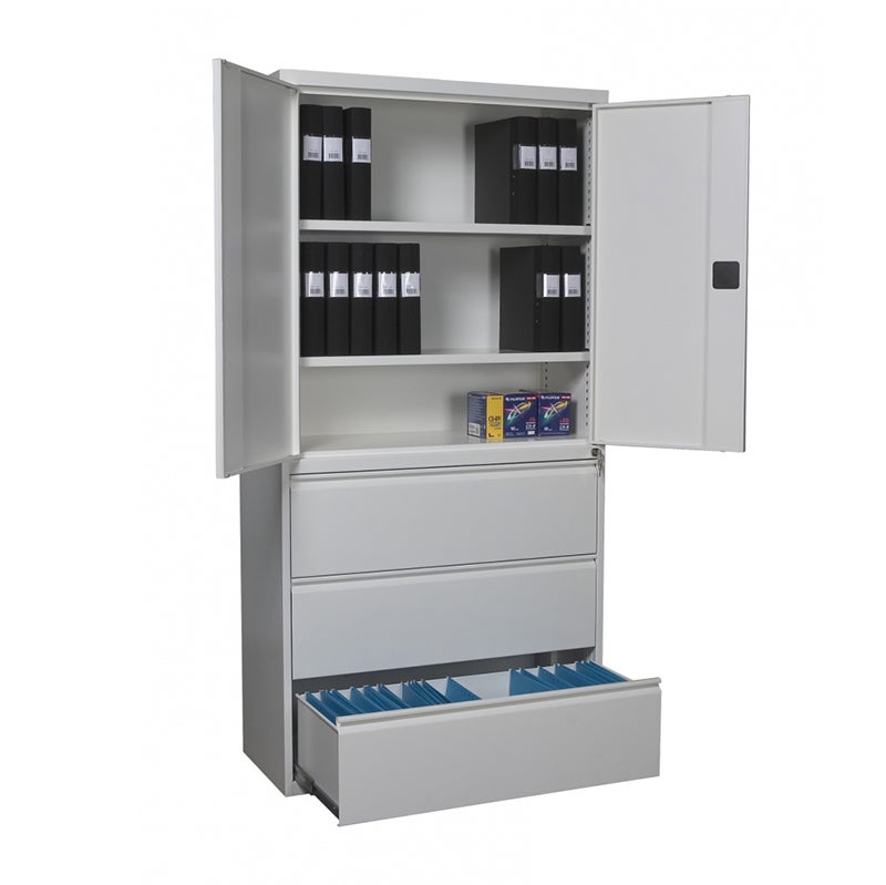 Kombinerat förvaringsskåp och flankskåp för hängmappar, pärmar och annat kontorsmaterial. Vippsäkra lådor utrustade med centrallås samt låsbara dörrar med spanjolettlås. Lackerat i vit färg. Levereras monterat. Som tillbehör finns hängmappar.