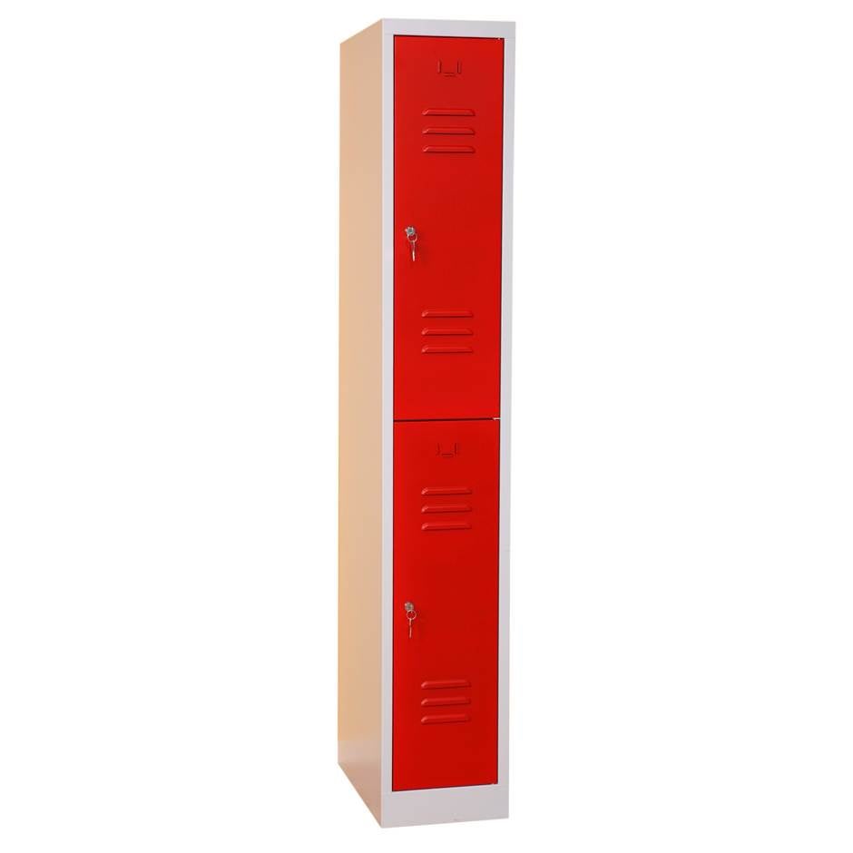 Småfackskåp för personlig förvaring. Skåpen levereras i färdigmonterade enheter. Detta skåp är försedd med cylinderlås. Huvudnyckel kan erhållas. Röda dörrar med grå stomme.