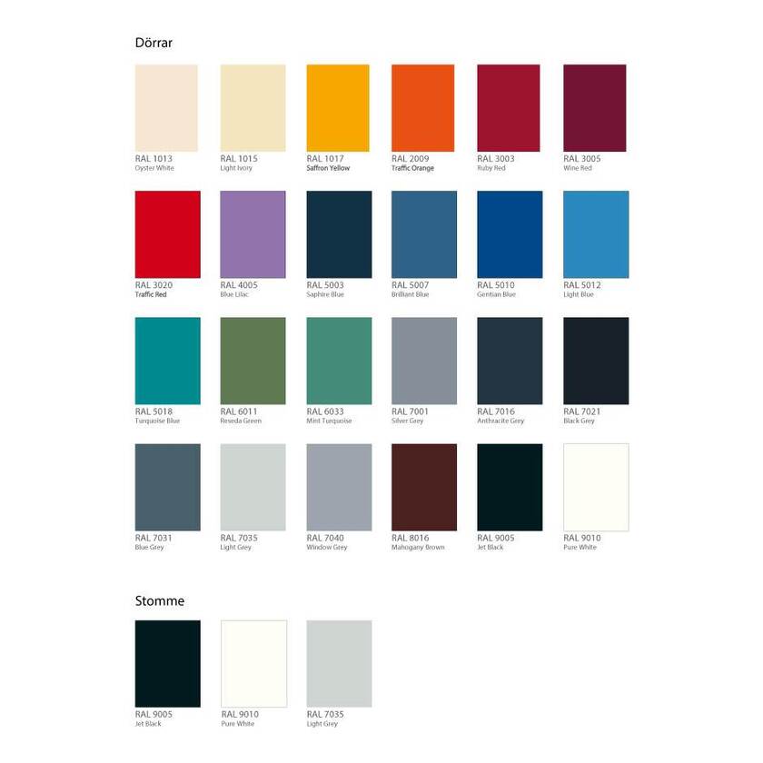 Småfackskåp SMB är ett platsbesparande alternativ för förvaring av små värdesaker. Skåpet består av en helsvetsad stomme med heltäckande sidor. Skåpet kan antingen monteras på vägg eller ställas på sockel.. Den pulverlackerade ståldörren är tillverkad i 0,6 mm tjock plåt, total tjocklek 18 mm. Dörren har dolda gångjärn och är försedd med cylinderlås Eurolocks ED400, två nycklar ingår. Skåpets pulverlackerade stomme är tillverkad i 0,6 mm tjock plåt. Som standard finns skåpet med grå stomme och dörrar i svart, grått eller blått. Kontakta oss vid intresse av andra färgval. Totalt finns 24 färgval på dörrar och 3 färgval på stomme.