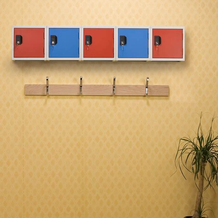 Kubformat småfackskåp som placeras efter behov. Kan byggas ihop på höjden och bredden, samt ställas på golvsockel eller hängas på vägg. Dörren har cylinderlås med två nycklar. Ljusgrå stomme med lucka i färgerna röd eller blå. Mått B450 x D450 x H450 mm.