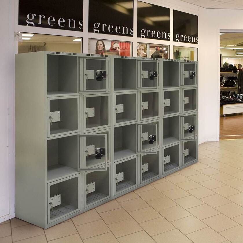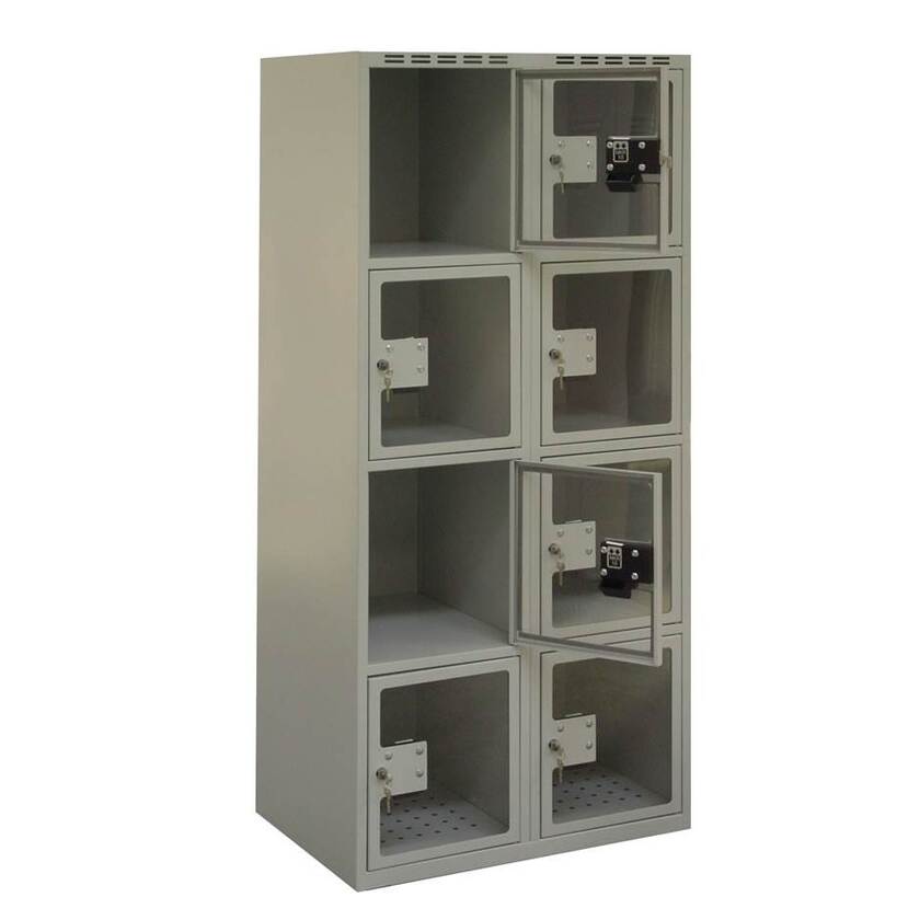 Småfacksskåp med luckor av plexiglas för synlig men samtidigt skyddad förvaring. Försett med cylinderlås. Modul med 8 st luckor, totalmått B800 x D550 x H1800 mm.