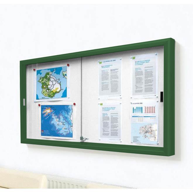 Tavlan är tillverkad av elförzinkat stål med vitlackerad exponeringsyta. 2 st skjutdörrar i 6 mm säkerhetsglas, lås med 2 nycklar ingår. 60 mm ram i lackerad aluminium med rundade hörn för ökad säkerhet. Välj mellan ram i färgerna röd RAL 3020, blå RAL 5010 eller grön RAL 6005. Tavelryggen är magnetisk.