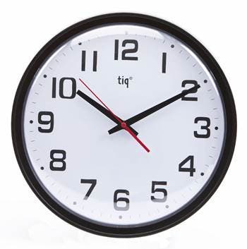 Väggur med plastlins och svepande visare (inget tickande). Speciellt lämplig till förskola, restauranger och livsmedelsindustri då man ej riskerar glaskross om klockan av någon anledning faller ner. Finns med vit eller svart ram. Vit tavla. Storlek Ø348 mm.