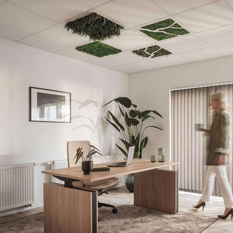 Ett helt nytt sätt att få in växter och liv i alla rum och en perfekt lösning när vägg och golv inte räcker till. Vår grönskande takbsorbent ger den nordiska naturen en plats i rummet och skapar en skön, avkopplande atmosfär. Takkassetten med lummig buxbom ersätter den tråkiga gipsplattan i taket och blir en läcker dekoration som samtidigt har ljudabsorberande egenskaper. Fästs i befintligt ramverk och passar såväl A- som E-kassett.
