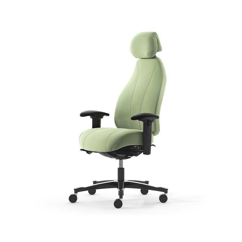 Kontorsstol Malmstolen 7000 med hög rygg, Dux-sits, nackstöd i tyg, armstöd Corona, hjul hårda golv, Tyg Capture 6501 Grön