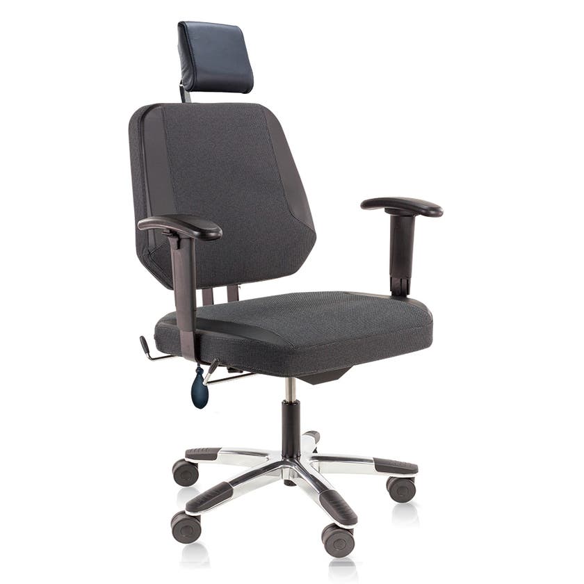 Kontorsstolen MaXX Line Large har en otroligt stark stålmekanism, kraftig gaspatron, generös sittbredd på 650 mm och ryggstöd med bredd 560 mm. Stolen står stabilt på ett Ø 700 mm polerat fotkryss och rejäla Ø 75 mmm hjul ger god rörlighet. Sitsvinkeln är justerbar i 3 lägen och stolen har även ryggvinkeljustering med gaslyft från 83° framåt till 106° bakåt. Denna modell är även utrustad med justerbara armstöd, uppblåsbart svankstöd och nackstöd.