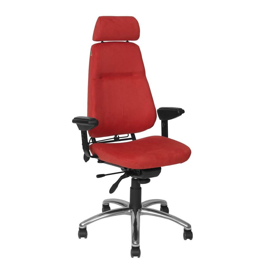 Stolen är klädd med flamsäkert tyg Gaja, 100% kamgarnsull. Välj mellan 6 olika färger. Nack- och armstöd ingår. Som tillbehör finns luftreglerat svankstöd och fotkryss i aluminium.
