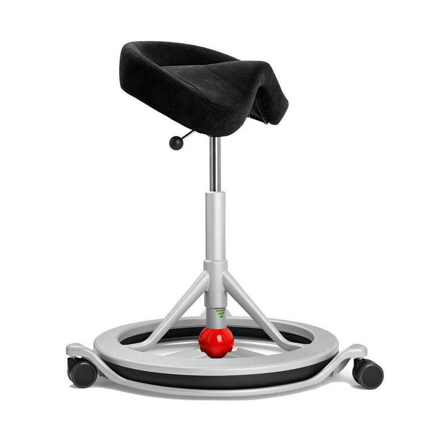 På Back App Chair sitter du med fötterna på en fotring med ett dämpande polster. Fotringen och de rörelser som uppstår när du balanserar på den centrala kulan, leder till den goda och komfortabla känslan du upplever när du sitter på en Back App Chair. Det är en stol som ger dig något extra. Genom att vända på stolen och vrida på den röda kulan så ställer man höjden på kulan i förhållande till fotringen, på det sättet justerar du lutningsrörelsen som bestämmer hur mycket kroppen behöver kompensera för att behålla balansen.