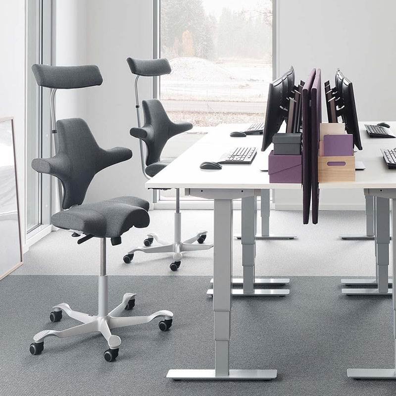 Capisco 8106 är en klassisk bästsäljare. Modellen har sina rötter så långt tillbaka som 1974, har under årens gång hela tiden uppdaterats för att främja funktionen och optimera tillverkningsprocessen. Sadelstolen har en ikonisk design med grundtanken att erbjuda en sitthållning likt den på en hästsadel. Stolen är justerbar för att kunna användas i både låg och hög arbetsposition, hela vägen upp till stående position. Capisco tillåter ett dynamiskt sittande med balanserat stöd oavsett sitthöjd och position. Stativet har fem armar (Ø730 mm) med lättrullande hjul vilket ger en stabil sittkänsla. Lämplig för bord med arbetshöjd 720 mm och däröver.